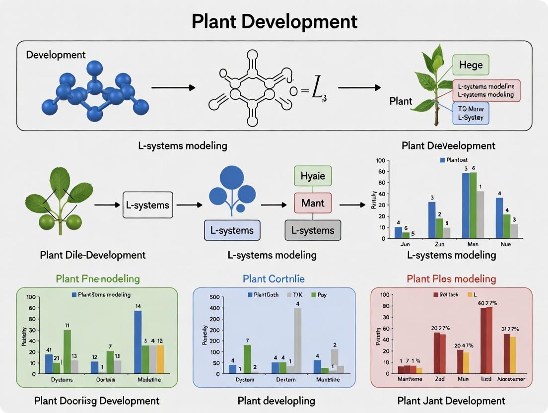 Plant development is governed by complex signaling networks involving hormones like auxin, cytokinin, and transcription factors. L-system productions can encode the outcomes of these pathways.