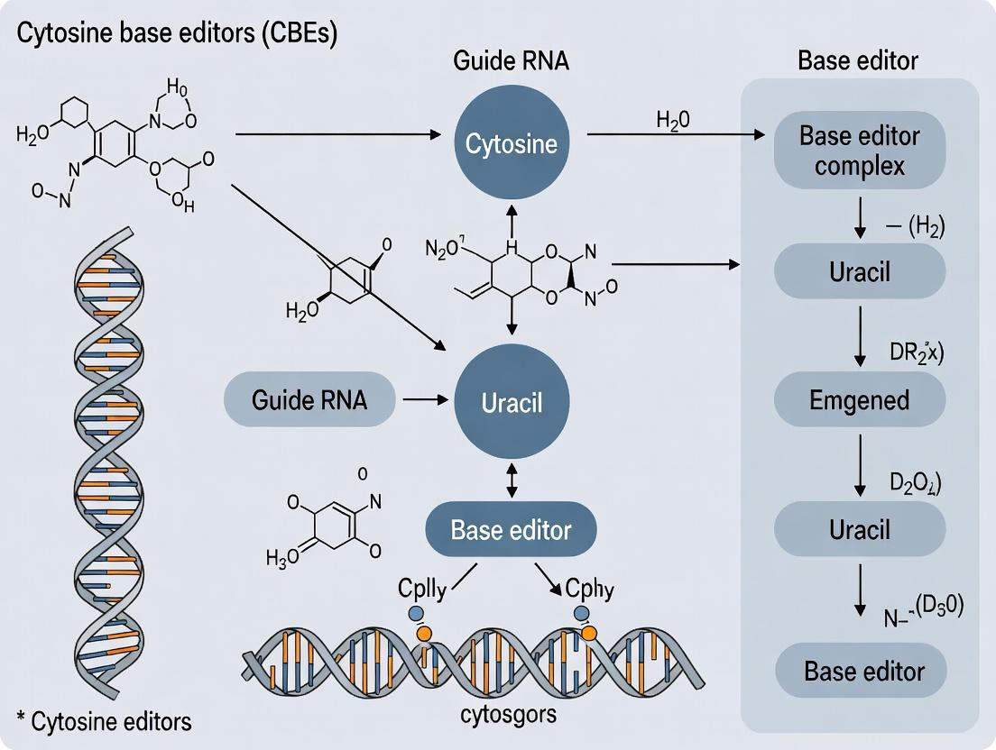 This article provides a comprehensive overview of cytosine base editors (CBEs), a transformative class of precision gene editing tools. It explores the foundational molecular architecture of CBEs, detailing how they combine a deaminase enzyme with a CRISPR-Cas system to achieve programmable C•G to T•A base pair conversion without creating double-strand DNA breaks. The guide covers methodological workflows for experimental design, delivery, and application across diverse research and therapeutic contexts. It addresses common challenges in efficiency, specificity, and off-target effects, offering troubleshooting and optimization strategies. Finally, the article validates and compares current CBE variants, assessing their performance against other gene editing modalities. Aimed at researchers, scientists, and drug development professionals, this resource synthesizes the latest advances to inform the effective and responsible use of CBEs in genetic research and therapeutic development.